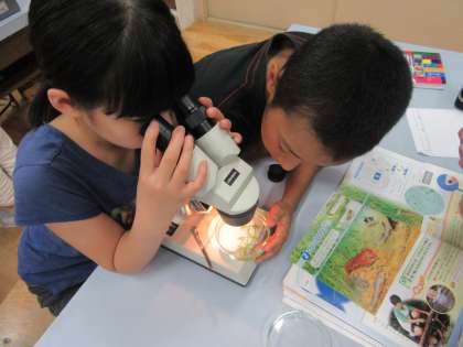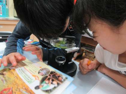 子どもたちは,顕微鏡をのぞきながら,たまごの中に見えるめだかの体の一部や,孵化直後のめだかを見てとても驚いていました。