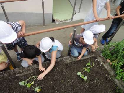 2年生の学年の畑にさつまいもの苗を植えました。初めてさつまいもの苗を目にした子どもたちが多く,根がないことに驚いていました。大きなさつまいもが育つように,これから自分が育てている野菜の水やりだけでなくさつまいもの水やりも頑張ってほしいです。