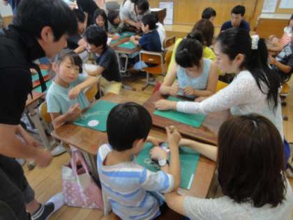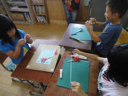 絵を描いた後は,きりを使って,穴をあけました。初めての経験なので,保護者の方々に手伝ってもらいなんとか穴をあけることができました。そして穴にひもを通して結びました。穴にひもを通すのも一苦労です。小さい穴に通ったときは,喜びの声があがっていました。