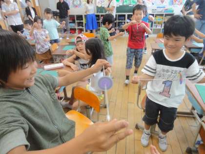 完成した『ぶんぶんごま』をまわして遊びました。まわすのにはコツがいりますが,保護者の方にアドバイスを頂きながら,上手にまわしていました。お手伝い頂きありがとうございました。