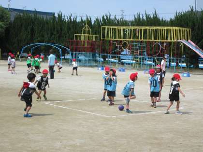 写真は,1年生の授業の様子です。1年生は,国語と体育の学習をしました。ころがしドッジボールでは,相手チームの人を当てようと工夫して攻めていました。