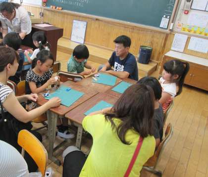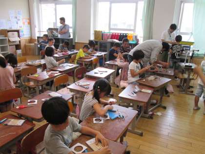 2年生の授業の様子です。図工の“すてきなものいっぱい”の学習をしました。お家の方にも手伝っていただきながら,おもいおもいの「ぶんぶんごま」を作りました。