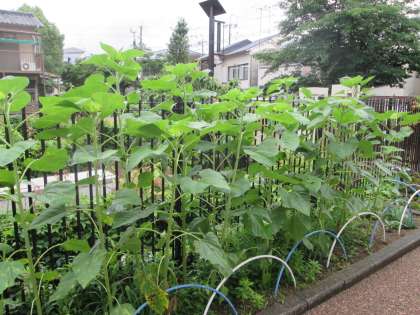 東校舎の東側の花壇に植えている向日葵が,最近の暑さで,いよいよ大人の背丈をも追い越さんばかりに伸びてきました。茎も,太いものでは直径3cmほどはありそうです。
