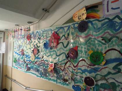 紙皿や,ビーズ等の装飾品を使い,海の生きものを表現しました。