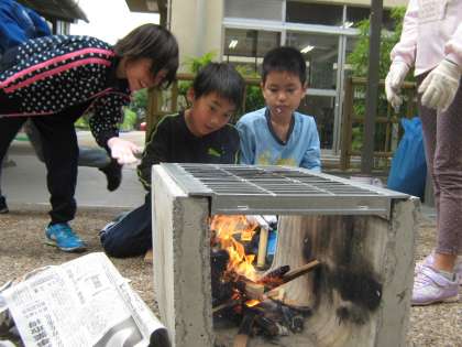 4年生はみさきの家で野外炊事をするため,学校の野外炊事場で火をつける練習をしました。