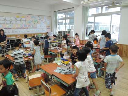 いろいろなはこを,どの班が一番高く積み上げられるかを競いました。