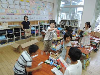 箱や缶の形をよく見て,積む順番や置き方をそれぞれ工夫していました。