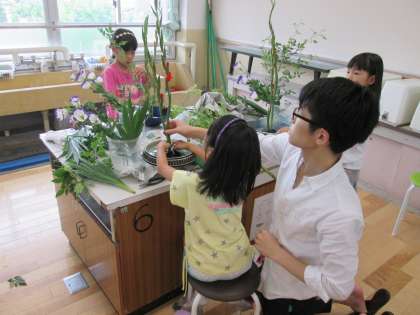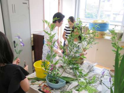 今月のテーマは「ソケイと梅雨の花を生ける」でした。今回は,グラジオラス・トルコキキョウ・ハマナデシコ・ソケイを花材として生けました。前回同様に,まず生け花についてのお話を聞かせていただいた後に,実習に入りました。