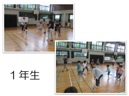 開会宣言の後,1年生から順に各クラスごとに計測しました。1・2年生とにじの子(低学年グループ)は大波小波で,3年生以上とにじの子(高学年グループ)は,8の字で跳びました。