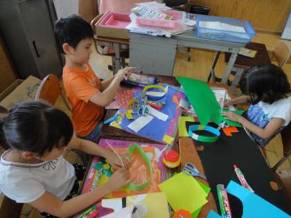図画工作科では,先週作ったわっかに飾りつけをしました。カラードフォルムや画用紙を切り貼りしたり,ボタンやビーズをつけたりと子どもたちは思い思いに飾りをつけています。どんな変身をとげるのかとても楽しみです。