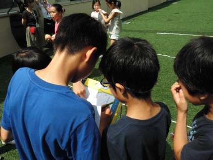 1つの地図をグループみんなでのぞき込んで頭を寄せ合う姿から,いろいろな学年の友達と関わり合うことの素敵さを感じました。