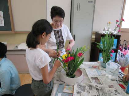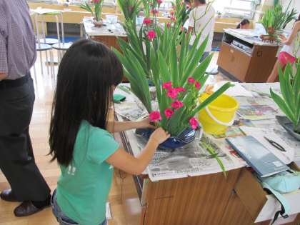 今回の花材の一つ,「ヒオウギ」は葉が扇のように広がっている花材でした。昔から祭りの際(京都では祇園祭)によく生けられてきた花材だそうです。扇に見える葉をどのように生けるかを考えながら,子どもたちは生けていました。