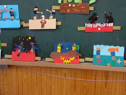 先日から,頑張って作っていた「仕組みを使って表そう」の作品が出来上がり,みんなで鑑賞会をしました。工夫したところを友達に言ってもらい,うれしそうに聞いていました。どの子も,動く仕組みを上手に使って仕上げていました。