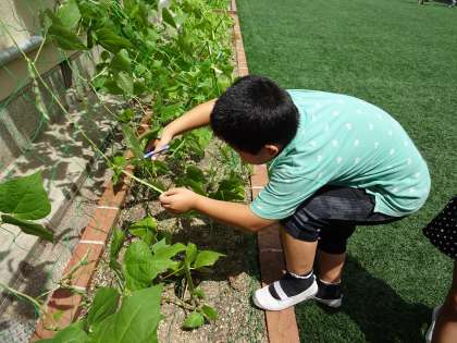 先日からの雨で,中庭のグリーンカーテンも大きく育ってきました。つるありインゲンは,食べごろになってきたので,収穫しました。4年生全員が何かを収穫し,家に持って帰って食べれたらと考えています。今回は,つるありインゲンを12人の子が持ち帰りました。他の植物(キュウリ・ツルレイシ・ヘチマ)も早く収穫できればと思います。
