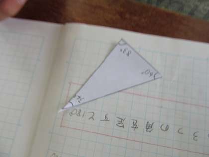 子どもたちは,それぞれ自由に三角形をかき,どの三角形も内角の和を求めると,180度になることを確かめられました。