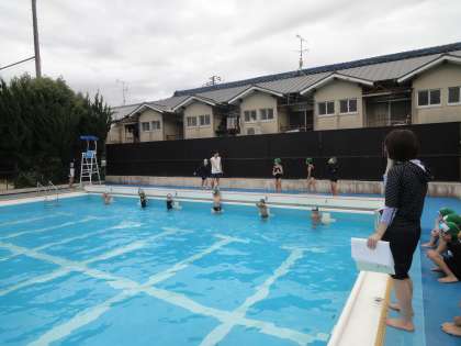 今日はあまり天候に恵まれず少し気温は低かったのですが,水遊びの学習をすることができました。これまで,ふし浮き,だるま浮き,けのび,バタ足などの練習に励んできました。その練習の成果を発揮するためにテストにのぞみました。それぞれに今持てる力を出し切って泳ぐことができました。