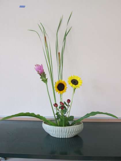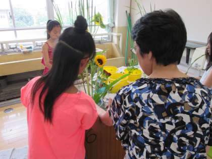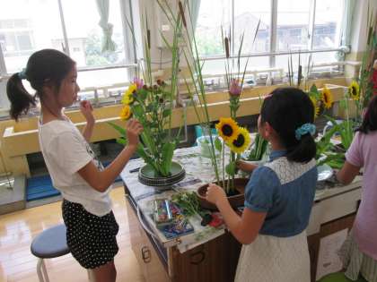 今回の花材の一つ,「パイナップルリリー」は,花ではなく葉を花材として生けました。南国風の大きな平たい葉ですが,切り口からは粘り気のある液体が出るので,子どもたちは少し苦戦しているようでした。ヒマワリと合わせ,夏を思わせる作品になるよう,工夫して子どもたちは生けていました。