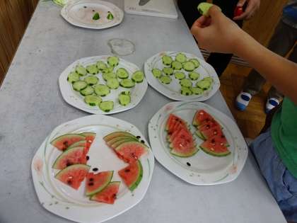 スライム作りの後は,グリーンカーテンで育てている小玉スイカ・キュウリをみんなで食べました。今回食べられそうなスイカが,1つしかなかったので小さなスイカをみんなで分け合い,試食しました。予想以上に甘く出来上がり,子どもたちは大喜びで食べていました。