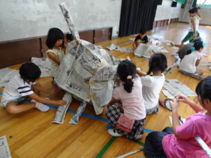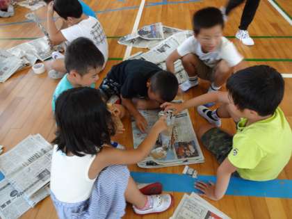 子どもたちは,友達と協力して,新聞紙で色んな作品を作り上げていました。久しぶりにみんなで遊ぶことができて,子どもたちはとても楽しそうでした。