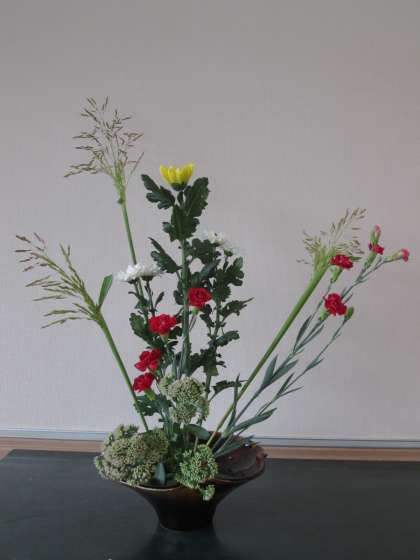 今回も赤・黄・白と,色とりどりの花材を用意していただきましたので,どのように生けるかを子どもたちはいろいろ考えていました。