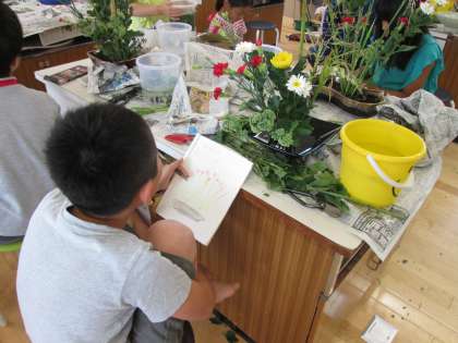 がんばって生けた後には,いつものようにノートに自分の作品をスケッチしました。先生方にご指導いただいたことやアドバイスをもとに,今回も子どもたちは楽しみながら生けていました。