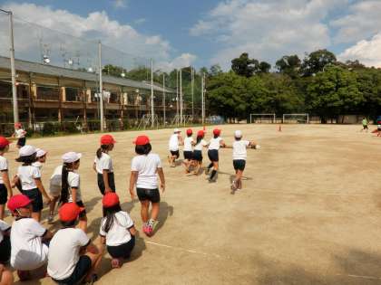 台風の目の練習を始めました。昨日は学年合同チームでお試しをしました。今日はいよいよクラスに分かれての練習を始めました。