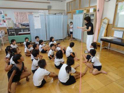 今日は約5カ月振りに身体計測を行いました。身体計測の前には,養護教諭から体の中にはどんなものがあってどんな働きをしているのか,教えていただきました。実際に,布でつくった内臓を見せてもらったり,小腸の長さをひもで表してもらったりしたことで,低学年にとっても分かりやすく,子どもたちは食い入るように話を聞いていました。