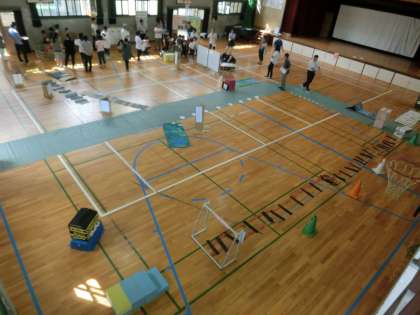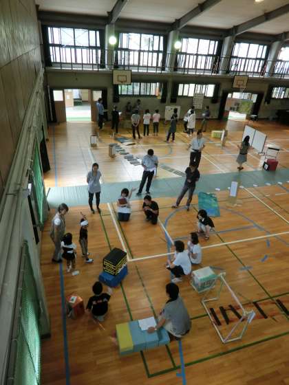 講堂に京都市内の通りや地下鉄の線路を作ったものを置いて行き方を動作化することで説明しやすくしました。