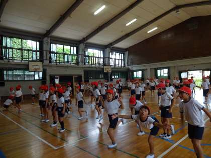 今日の3校時は,講堂で運動会の練習をしました。みんなで合わせて踊る練習をしました。速い曲で,なかなか曲と踊りが合わなくて,四苦八苦していました。