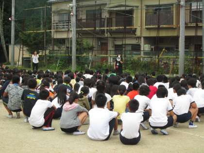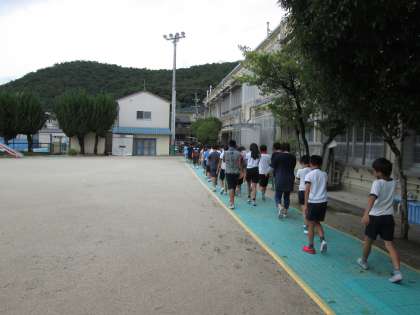 まず各学級で安全指導をした後,放送を合図に第2グランドへ避難しました。全員が避難を完了した後,校長先生からお話ししていただきました。