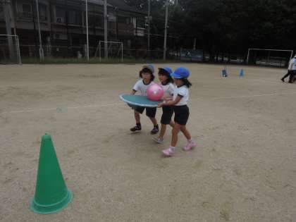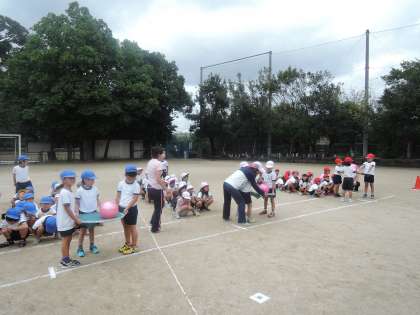 運動会の団体競技であるボール運びリレーの練習をしました。