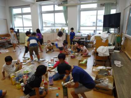 生活科「あそんで ためして くふうして」の学習では,家から持ってきた牛乳パックやペットボトルなどを使って,どんな遊びができるかをみんなで考えました。子どもたちは友だちどうしで相談しながら,どんな遊び方ができるか,どのような道具があるかを考えながら,楽しそうに取り組んでいました。