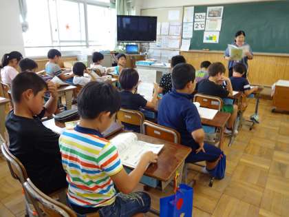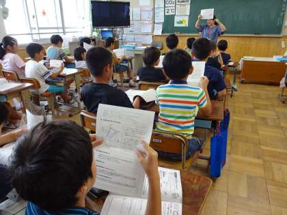 先週の金曜日の2・3校時に夏休みに行ったエコライフチャレンジの振り返りを,気候ネットワークの方々と一緒に行いました。まず,夏休みに取り組んだエコライフの診断書を一人ずつもらいました。それぞれの項目に診断されていました。もらった子どもたちは,じっくりと見て喜んでいる子・反省している子・・様々な様子でした。
