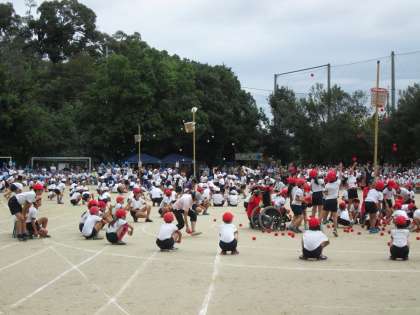 運動場の端の方は,昨夜の雨でまだぬかるんでおり,ご覧いただく保護者の皆様や地域の皆様にはお足元の悪い中ご不便をおかけしましたが,競技・演技を始めるころにはトラックには水たまりもなく,子どもたちは練習の成果を一生懸命発揮することができました。今年度は,新しく「エントリー種目」を実施し,学年の枠を超えて,協力しながら玉入れや綱引き,リレーに挑む子どもたちの姿が素敵でした。