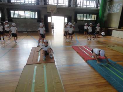 今日は久しぶりに『マット遊び』を行いました。前回挑戦していた技を思い出しながら,連続技にも挑戦しました。前転,後転,側転が上手にできるようにたくさん練習してほしいと思います。
