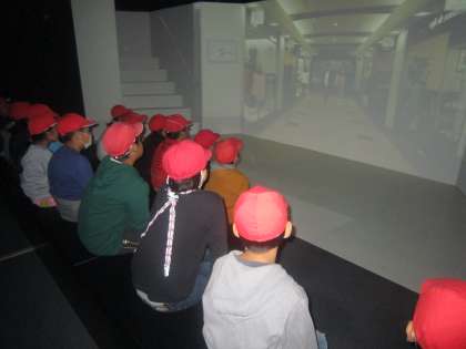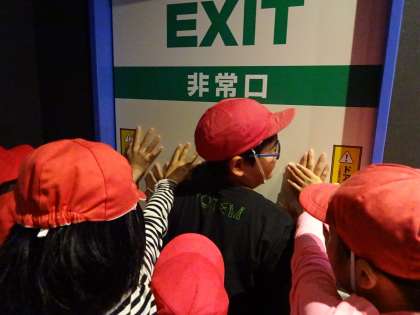 4Dシアターでは,地下にいた時に大雨が降り水が地下に流れ込んだら,どんなに大変なのかを学びました。水深10cmまで流れ込んだだけで,非常口の扉が開きにくく,水深40cmになると数人で扉を押しても開かないということが分かり,子どもたちは驚いていました。早く避難する必要があることが分かった体験でした。