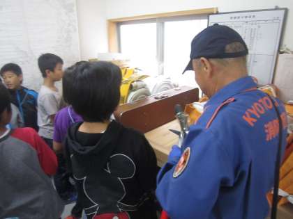 シアターで話を聞いた後は,学校内にある金閣消防分団の分団室を見せていただきました。様々な道具があり,子どもたちは興味津々でした。