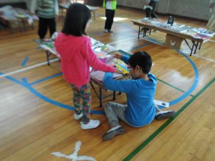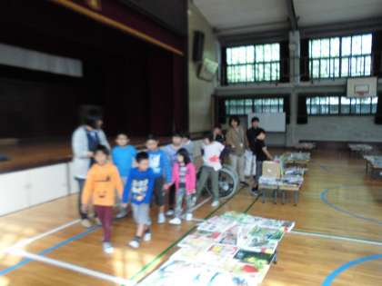講堂でたくさんの本を見て,自分の好きな本を選びました。