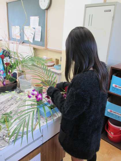 今回の花材の一つ「ドラゴン柳」はひょろひょろと伸びた枝が特徴的な花材でした。生けた後からでも,小さな黄緑の葉が生えたり,根が出てきたりするそうです。植物の生命力の強さを感じながら,子どもたちも生けたことと思います。