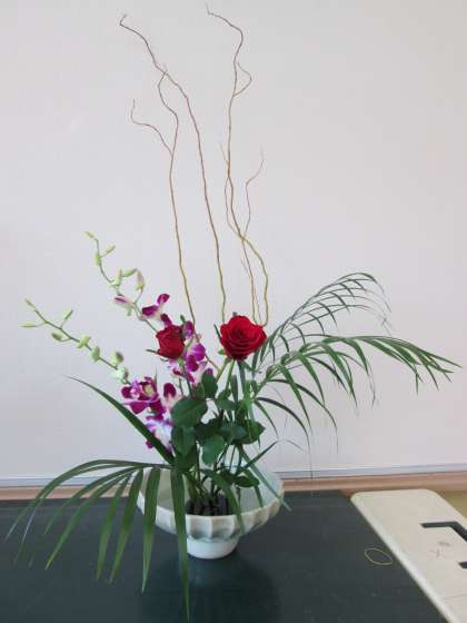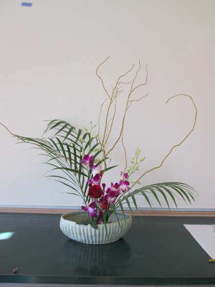 今回はラン科のデンファーレ,バラ,ドラゴン柳,アレカヤシを花材として生けました。今回はデンファーレとアレカヤシが花材にありましたので,テーマを「南国の花を生ける」にしました。