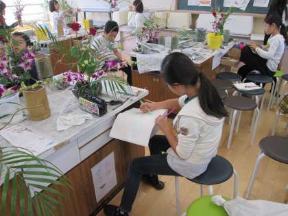 子どもたちは,先生方にご指導いただいたことやアドバイスを作品に生かそうと工夫していました。同じ花材を用いても,その子の感じ方や考え方によって,違った作品が生まれます。生けた後には,いつものようにノートに自分の作品をスケッチしました。