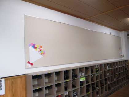 そこで,教育後援会にお世話になり,この度エントランスに掲示板を設置していただきました。エントランスの幅いっぱいの,大きな掲示板です。ポスターの掲示等,いろんな場面で活用させていただきます。ありがとうござます。