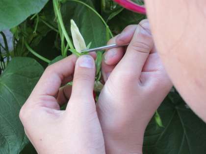 アサガオのおしべをとり,受粉させたものと,受粉させなかったものを準備しました。