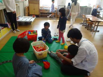 初めに「なまえ」という歌を歌って自己紹介をし合い,次に「よろしくね」という曲で楽しく踊り,最後はトランポリンを一緒に楽しみました。