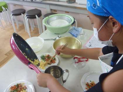 調理実習をしました。朝食で手際よくいためものを作るイメージをしながら,工夫して調理することができました。今回作ったのは,ホウレンソウの炒め物・いろどり野菜炒め・スクランブルエッグです。