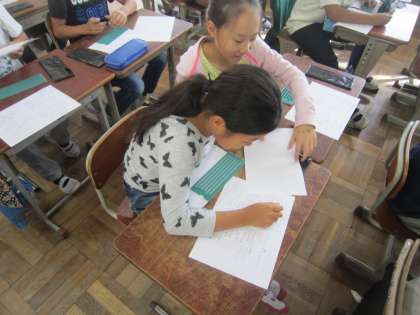 はばたきの学習で共に生きるとはどういうことか考えています。今日は点字を打って読んだり,アイマスク体験をしたりしました。子どもたちは,「見えないことは大変なことが多い」「すごく怖かった」などと感想を話していました。