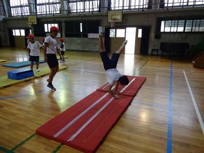体育の学習で,マット運動をしています。いろいろな場を設定して,がんばって練習しています。ゴムの場では,側転の脚ができるだけ伸びることを意識できるように,また川の場ではまっすぐに回わることを意識できるようにしています。それぞれの場で意識することで,よりきれいに技ができるようになってほしいです。
