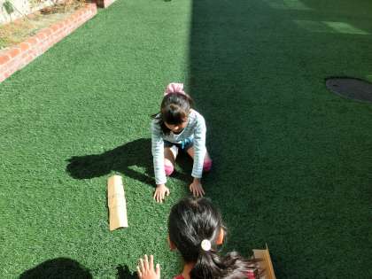 今日はとってもいい天気だったので,ひかげとひなたの土の様子や温度を調べる活動をしました。実際に手を当てて様子を観察・実感したり,温度計を土にさして時間経過による温度変化を記録したりしました。意欲的に活動していました。