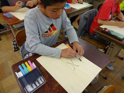 今日は,5本の彫刻刀の名前や持ち方等を教わりました。その後に,初めて彫る練習をしました。恐る恐る直線や曲線を彫りましたが,思うように描いた線の上を彫れなく残念がっている子,4本の線を彫るだけで疲れた子・・等,様々な反応でした。次回は,今描いている仏像を彫ります。描いた線通りに彫れれば良いのですが・・・。