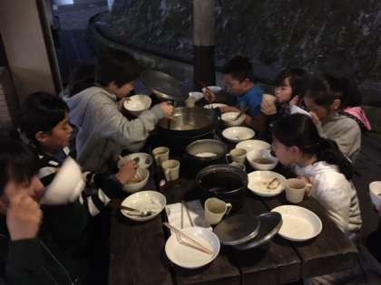 ごはんと豚汁ができあがりました。自分たちで苦労して作った料理の味は,最高です。ホームページでは味を伝えることができないのが残念です。いつもの夕食より,少し早い時間の食事かもしれませんが,しっかり食べて,夜の活動に備えます。